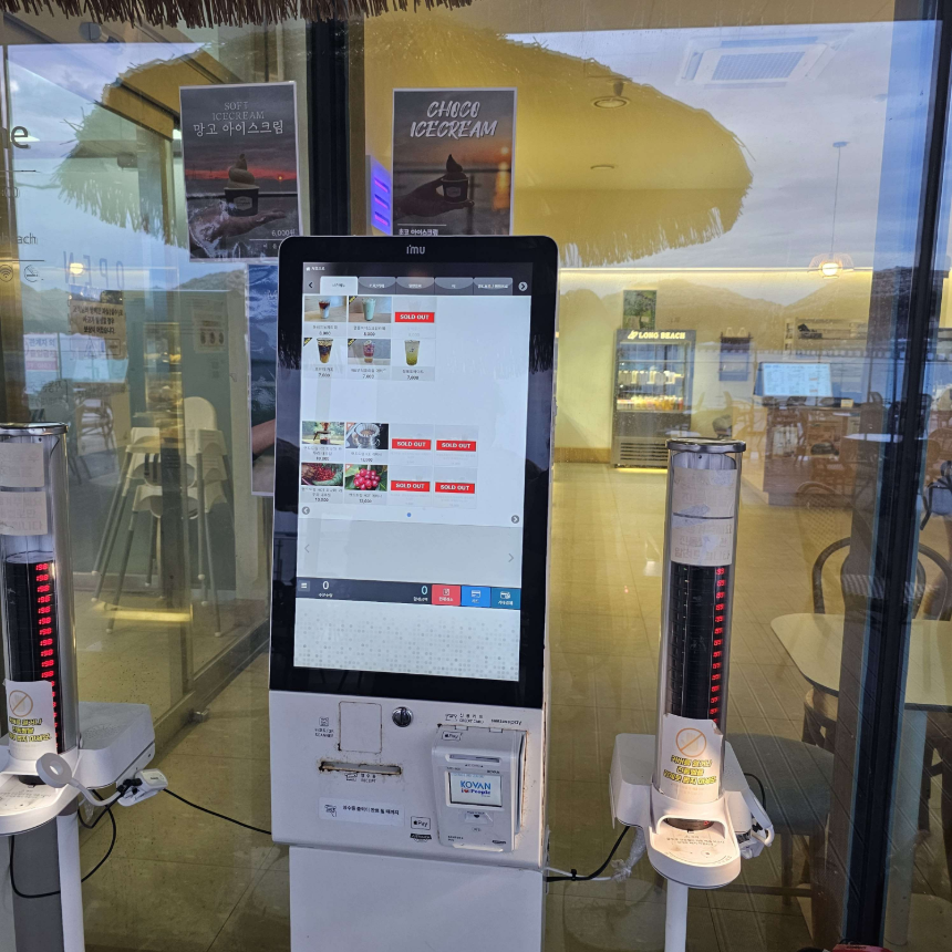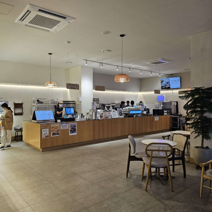 카페 입구엔 무인 키오스크가 있어서 대기 없이 주문할 수 있었고, 실내에는 셀프바가 잘 정돈돼 있어 필요한 것들을 손쉽게 이용할 수 있었어요.