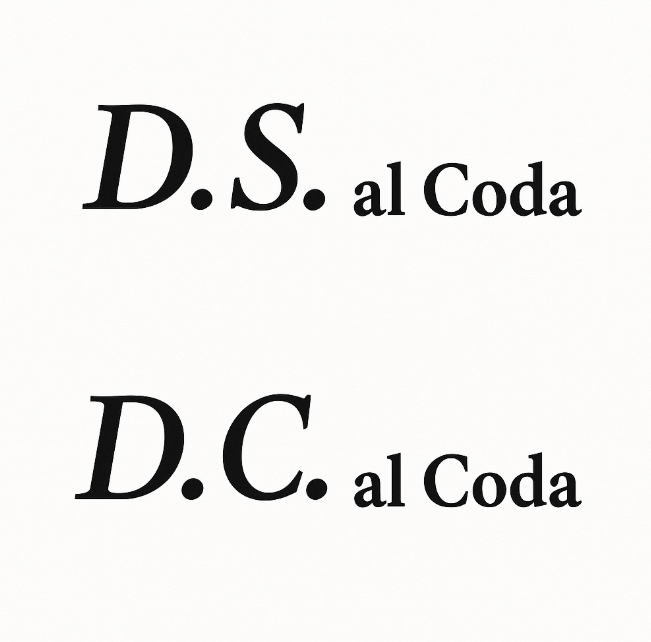 정리하자면, D.C. al Coda는 처음부터 다시 연주하되, 특정 시점에서 마무리로 점프하는 구조이고, D.S. al Coda는 곡의 중간에 있는 특정 지점에서 다시 시작하여 코다로 점프하는 구조입니다.